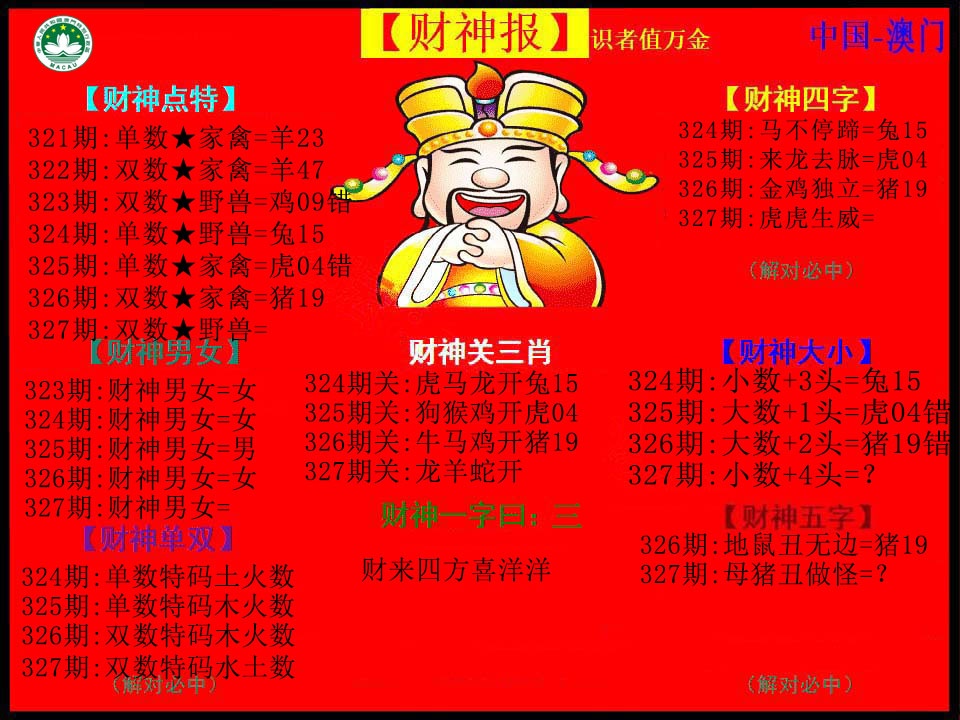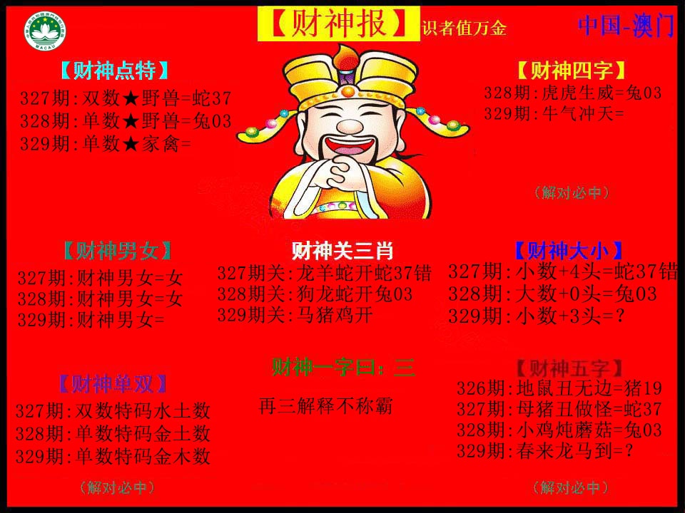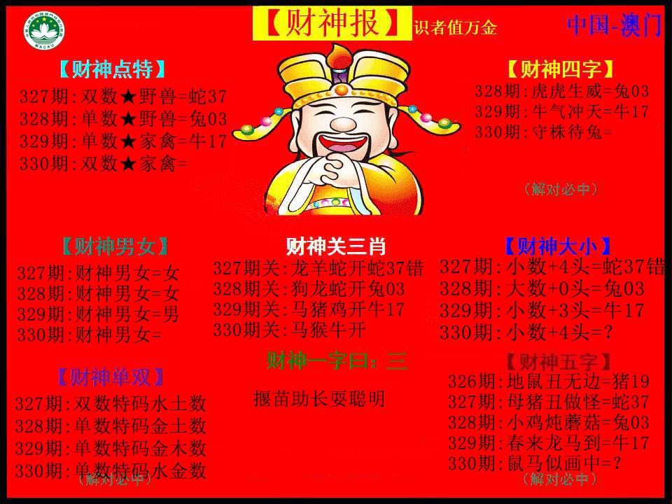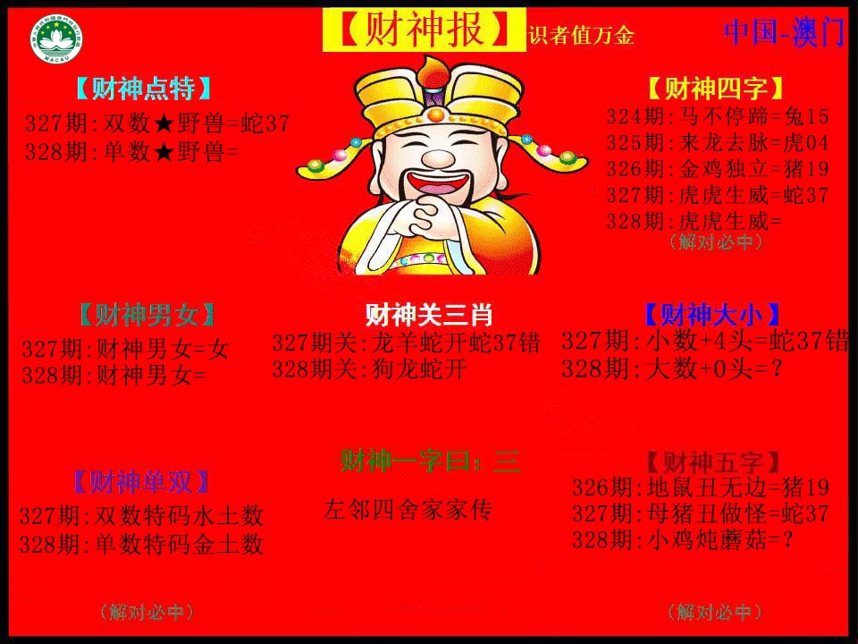 | 327期 | 单:蛇牛羊猪 | 双:龙猴虎狗 | 开蛇37 |